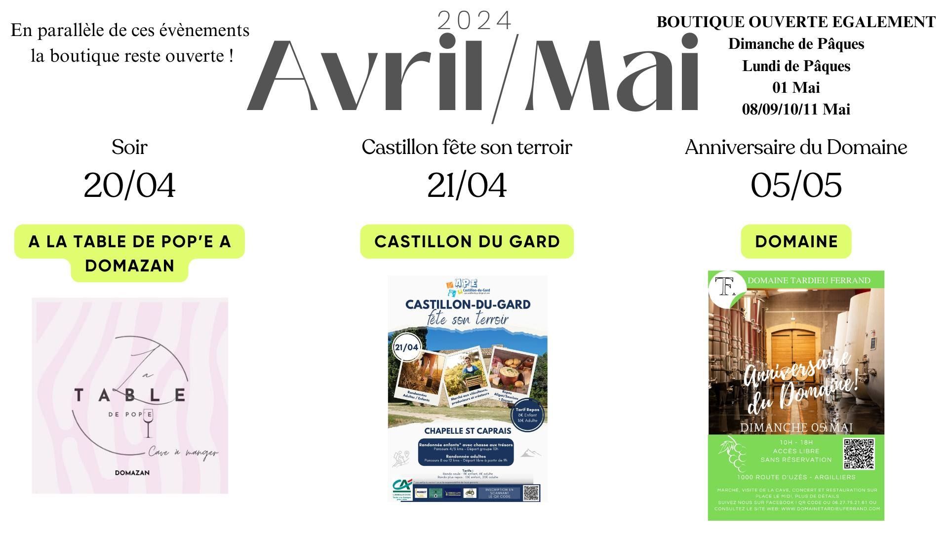 A venir également l'évènement Via Gusto avec l'Association Gard aux chefs le 8 Mai sur le site du Pont du Gard !