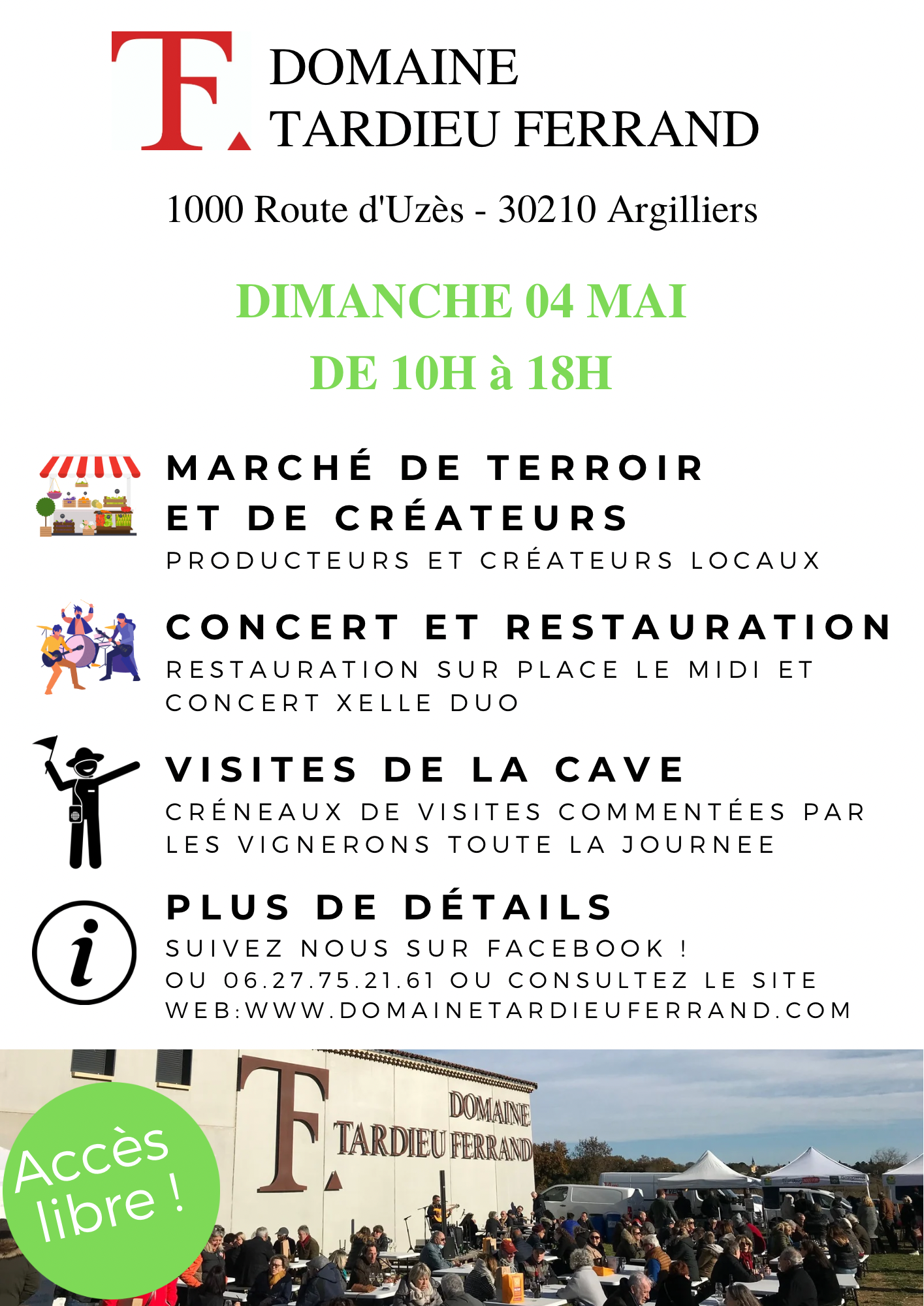 Journée portes ouvertes en libre accès avec visites de la cave, marché fermier et de créateurs, concert et restauration sur place le midi.