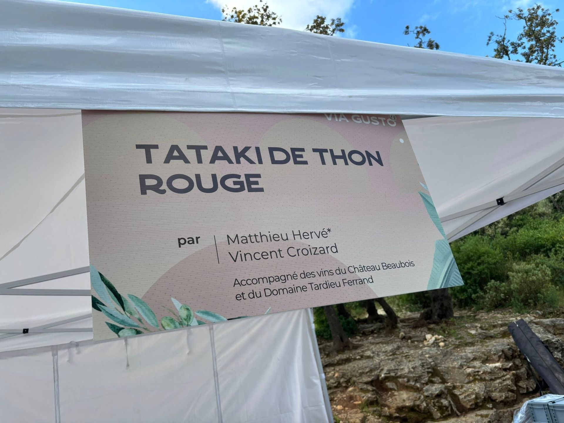 Le 08 Mai nous voilà de retour sur le Pont du Gard pour l'évènement Via Gusto. Rencontre d'exception avec un repas composé par les plus grands chefs du Gard ! Cette année c'est la cuvée Les Garrigues blanc qui a accompagné le plat de Matthieu Hervé* et Vincent Croizard; Grenache, Viogner, Roussanne, un match parfait avec le Tataki de Thon Rouge !